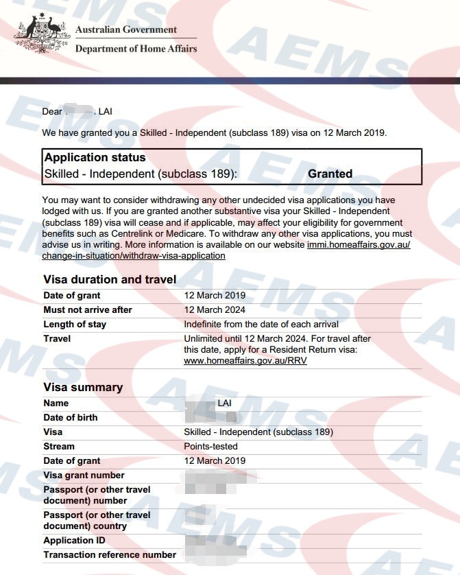 AEMS恭喜赖女士189独立技术移民签证顺利获批! -- 12/03/2019