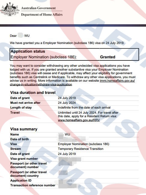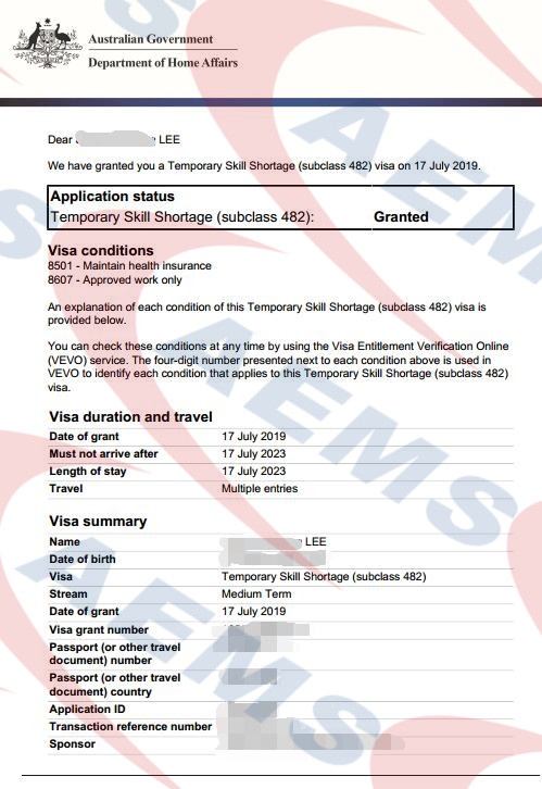 AEMS 恭喜L女士482雇主担保签证顺利获批!—— 17/07/2019