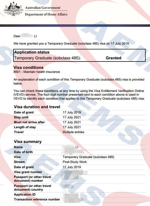 AEMS恭喜李女士485毕业生工作签证顺利获批! —— 17/07/2019