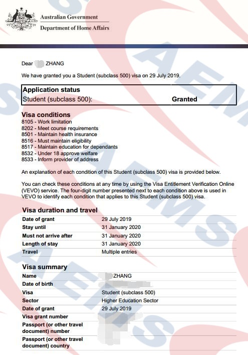 恭喜张同学500学生签证获批 —— 29/07/2019