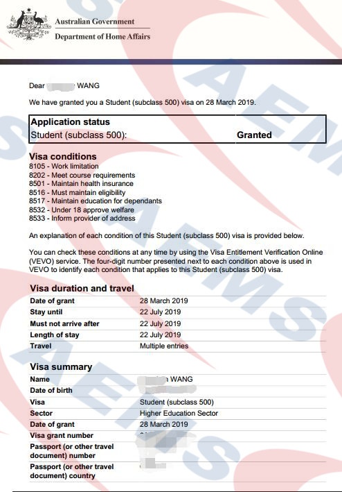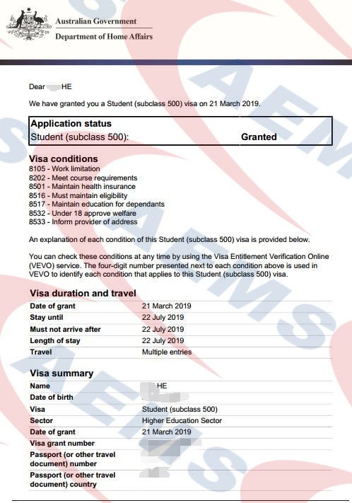 恭喜何同学500学生签证获批 —— 26/07/2019